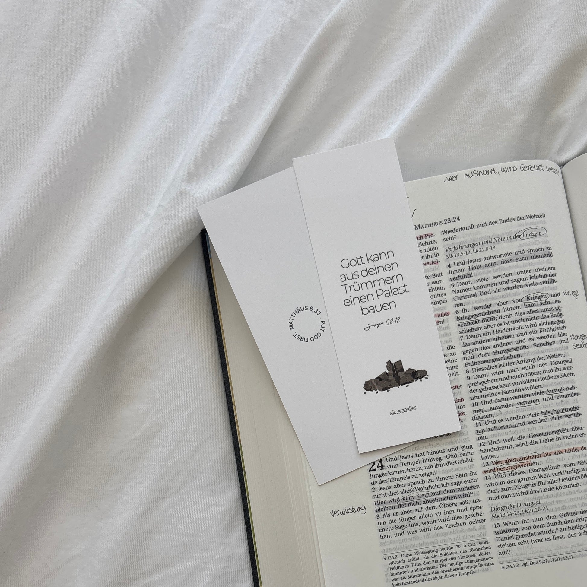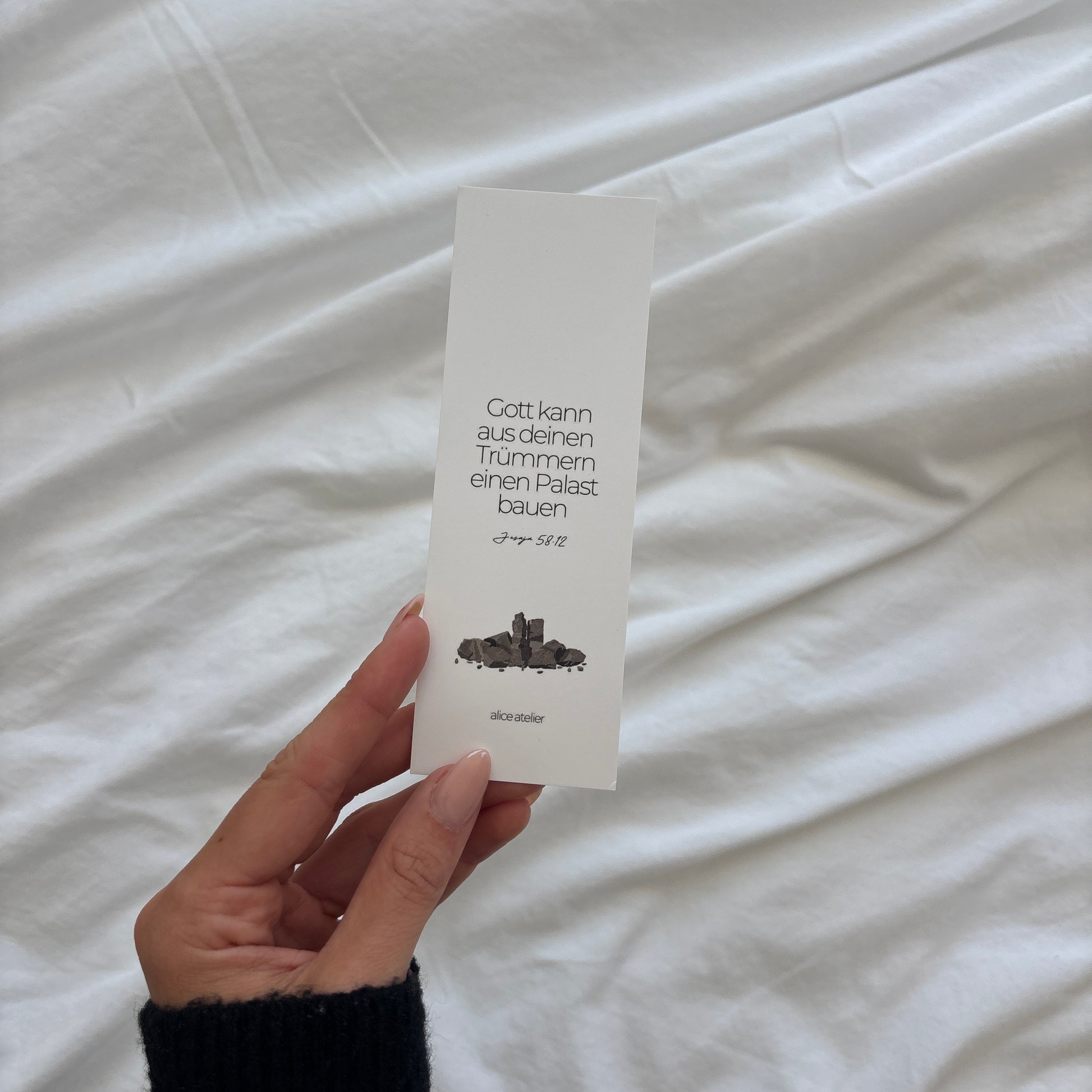 Ich hab lange nach schönen Lesezeichen gesucht für meine Bibel, aber bin nie richtig fündig geworden -also hab ich sie einfach selbst herstellen lassen. Es soll dich täglich in deiner Stillen Zeit daran erinnern, dass Gott aus deinen Trümmern ein Palast bauen wird und unser Ziel sein sollte seinem Herzen ähnlicher zu werden. <3